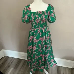Vibrant green dress with allover pink floral pattern. Smocked square neckline for comfy fit. Short puff sleeves and ruffled hem for a feminine look. Includes convenient side pockets. Ideal for daytime events and garden outings.
