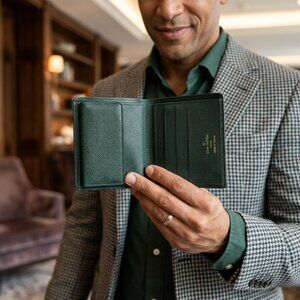 Elevate your everyday carry with this sophisticated Louis Vuitton bifold wallet in signature Green Taiga leather. Known for its durability and subtle cross-grain texture, Taiga leather offers a refined aesthetic for the discerning professional.