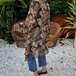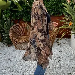 Beautiful vintage 90’s sheer, duster, kimono, cover up. I am 5’7” small for reference. Has a flowy oversized fit. Could fit a small to large depending on fit preference. Sheer chiffon like material unsure what it is because there is no content tag. In the last pic I show where there is some loose beading, but it does not affect the wear of the garment. There is beading throughout ok the flowers.