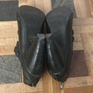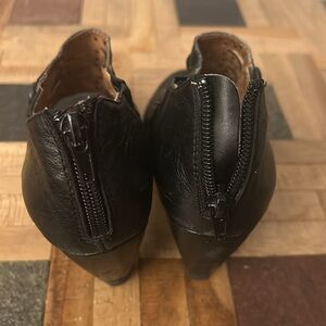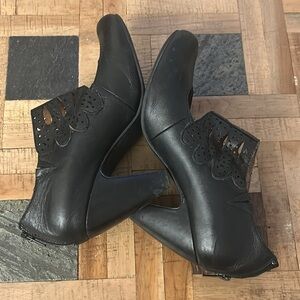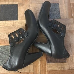 Leather upper Back zip Laser cut outs Button accents 3.5" heel Very good used condition - small scratches S1