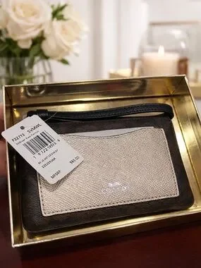 Coach Boxed Corner Zip Wristlet Brown Black Metallic Platinum NIB / NWT