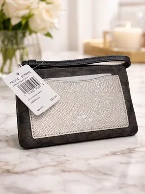 Brand new with tags Coach signature canvas wristlet in a beautiful brown, black, and platinum color combination. This sleek and compact piece is perfect for carrying your essentials while staying stylish.