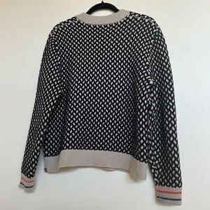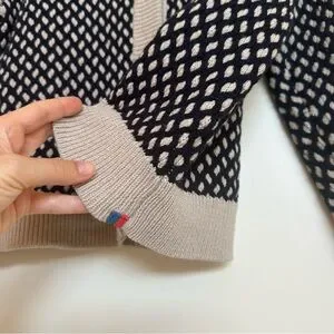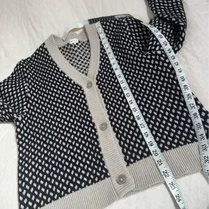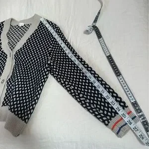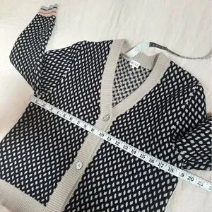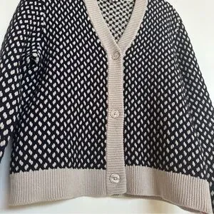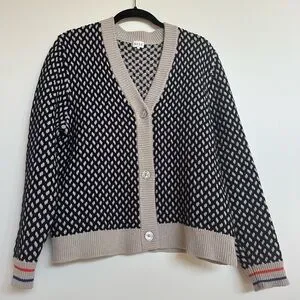 Elegant navy and cream cardigan with geometric pattern. Features a V-neck and button closure.