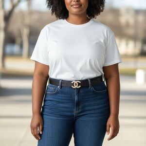Chic black belt. Features a gold buckle adorned with pearls. Perfect for adding luxury to any look.