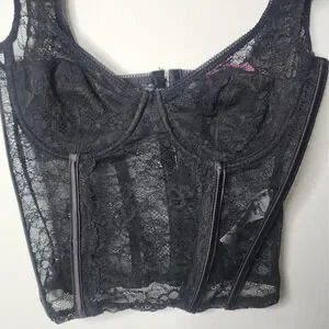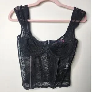 Keywords: lace top, bustier, corset, lingerie, goth, edgy, night out, party, clubwear, statement piece, fashion top, zipper front, cap sleeve