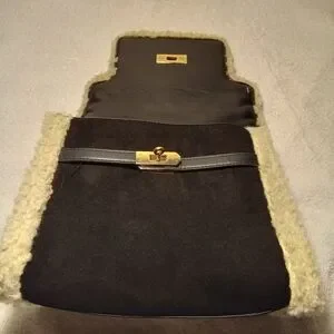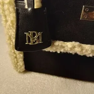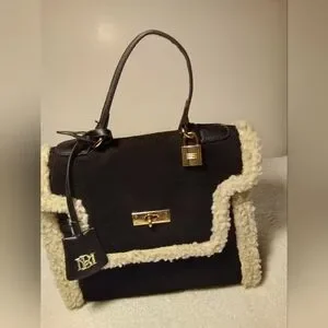 Chic Badgley Mischka satchel in black with cream shearling trim. Gold-tone hardware accents including a padlock and turn-lock. Top handle and detachable tag add polish. Versatile for day or evening wear. I dont have the crossbow strap and Im not familiar with the locking idea behind this bag. I've priced it accordingly.