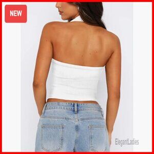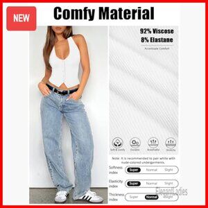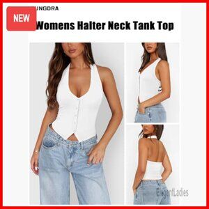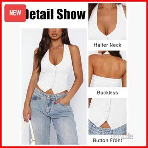 Ribbed Halter Tank Top Slim Fit Button Front Backless Crop Vest