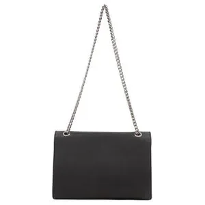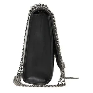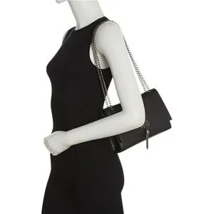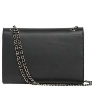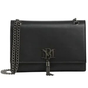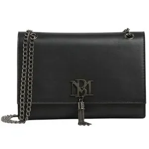 Badgley Mischka Collection Tassel Crossbody Bag. It is a structured evening accessory featuring a minimalist design with a signature polished logo and a decorative metal fringe tassel. Badgley Mischka Collection Tassel Metal Fringe Crossbody Bag