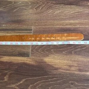 Stylish brown leather belt featuring a unique metal buckle. Perfect for adding a touch of sophistication to any outfit.