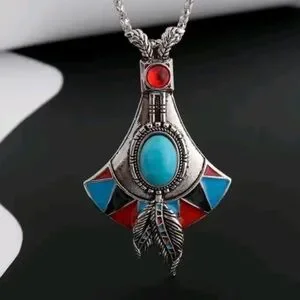 Embrace bohemian elegance with this stunning silver pendant necklace. Featuring vibrant turquoise and red accents, this piece adds a pop of color to any outfit. Perfect for any occasion.
