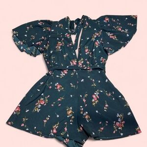 Green floral romper with puffy sleeves and open back