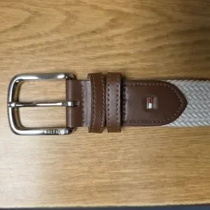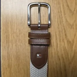 The Tommy Hilfiger Men's White Woven Stretch Belt with Leather Trim in size Large (38 to 40) is a stylish and comfortable accessory for men. Made in the Dominican Republic, this braided/woven belt features a solid white color with metal hardware and the iconic Tommy Hilfiger logo accents. The stretch material ensures a perfect fit while the leather trim adds a touch of sophistication to any outfit. This belt is a versatile and practical addition to any man's wardrobe.