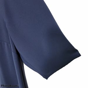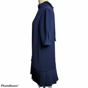 Elegant navy blue dress with pleated skirt. Perfect for any occasion.