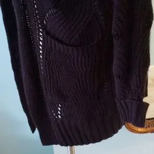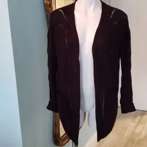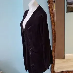 100% acrylic black pointelle sweater. Open front cardigan with pockets. Very cozy. Goes with everything!! Size M