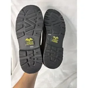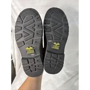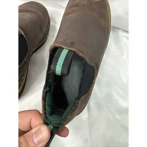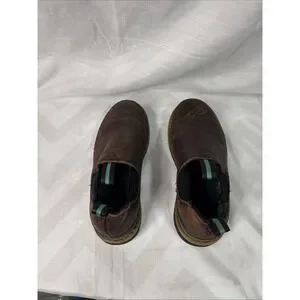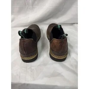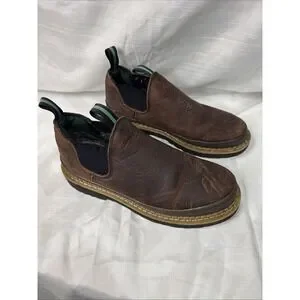 The Georgia Giant Romeo Men's Shoes in size 8.5M are stylish and durable slip-on boots designed for workwear occasions. Made of solid brown leather with a slip-resistant outsole, these boots feature a cowboy, equestrian, and Southwestern theme. The slip-on style and wide shoe width provide comfort and ease of wear, while the Georgia Boots brand ensures quality and craftsmanship. Perfect for those looking for a durable and trendy footwear option. Hardly used as you can tell by the soles. fast shipping!