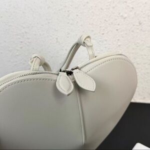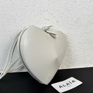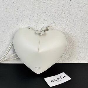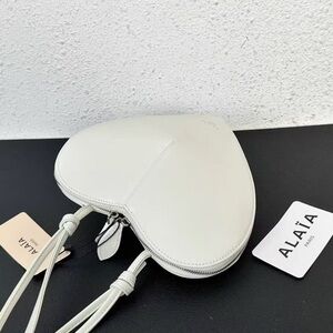Compact heart-shaped shoulder bag in smooth cream leather. Top zipper closure secures contents. Knotted leather shoulder strap for easy wear. Subtle Alaïa logo on front.