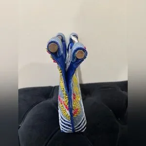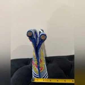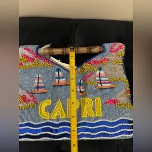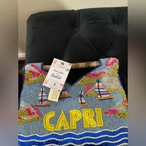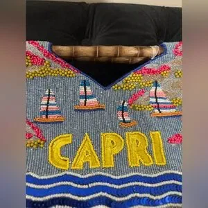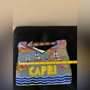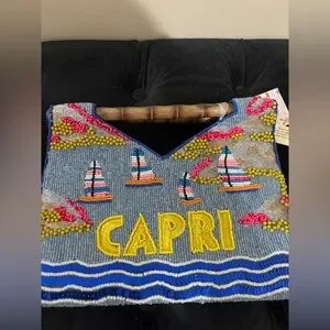 Hand-beaded canvas tote with colorful beach motif. Features bold yellow "CAPRI" lettering and multicolor umbrella accents. Bamboo top handles. Vibrant blue, yellow, pink and tan palette.
