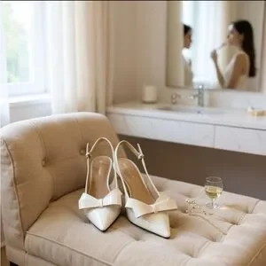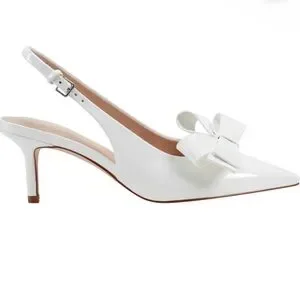 These Marc Fisher heels feature a pristine patent white finish and a sophisticated slingback design with a buckle closure. The pointed toe is adorned with a charming bow, adding a romantic touch to the classic silhouette. With a comfortable kitten heel, these shoes are perfect for formal occasions or bridal wear.