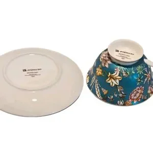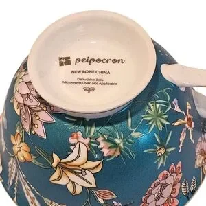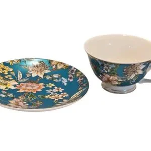 Peipocron British Floral Coffee/Tea Cup and Saucer Set with Gold Trim. Made from new bone china. Saucer measures 6" in diameter and tea cup measures 4 1/8" in diameter with a 7 fl oz capacity. Dishwasher safe. NOT: oven/microwave safe