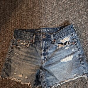 Classic light blue denim shorts from American Eagle Outfitters. Distressed detailing with ripped accents. Frayed hem for a relaxed vibe. Comfortable everyday style.