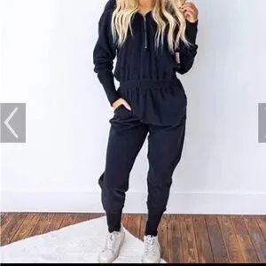 Comfortable black women's jogger jumpsuit with a drawstring pullover top and elastic waist. Soft fabric and tapered legs create a relaxed, everyday look. Easy-care design perfect for casual wear and travel.