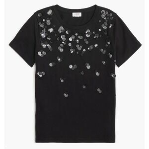 Elevate your everyday style with this captivating J. Crew black t-shirt adorned with shimmering sequins. The scattered, iridescent embellishments catch the light beautifully, adding a touch of glamour to a classic silhouette. Crafted for comfort and designed to impress, this top offers a versatile blend of casual ease and sophisticated sparkle. Perfect for adding a dazzling accent to your favorite jeans for a night out or dressing up a skirt for a chic ensemble.