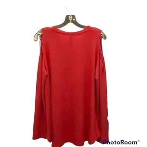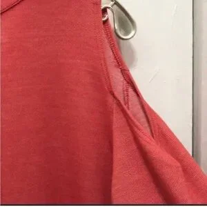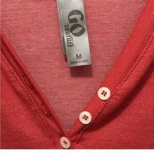 Coral Pink, High-Low & Cold Shoulder, V-neckline, Long Sleeves, Quarter Button-Up, Solid, Very Soft, And Made In The USA. Material: 47% Polyester, 47% Rayon, & 6% Spandex