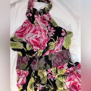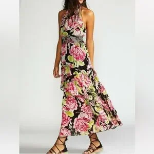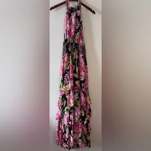 Embrace elegance with this stunning floral halter maxi dress. Featuring vibrant pink and green floral patterns on a classic black background, this dress is perfect for any occasion. Features a halter neckline, maxi length, and yards of flowy fabric.