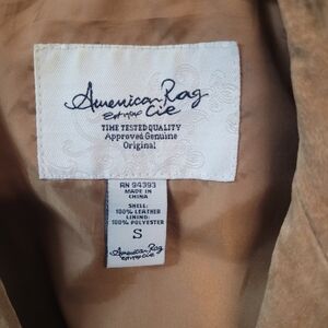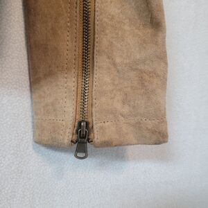 American Rag Brown Suede Genuine Leather Crop Moto Jacket Lined Women’s Small. There is some staining on end of sleeves and discoloration throughout. Did not try to clean.