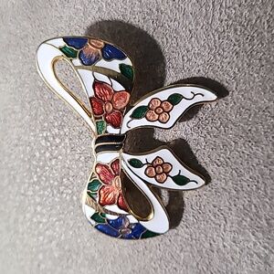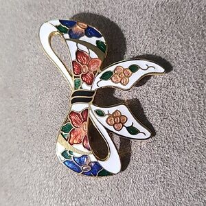 Vintage 1980's Gold Tone Cloisonne Bow Brooch Floral Enamel