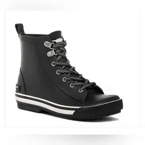 Keep your feet dry in style with these sporty black high top lace-up rubber rain boots.