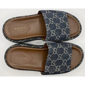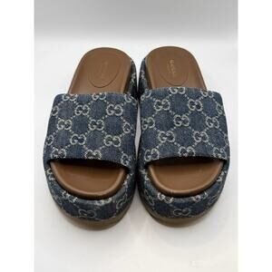 Gucci Cloth Mule Platform Blue Denim Monogram Sandals Size 35 US 5 MSRP $590