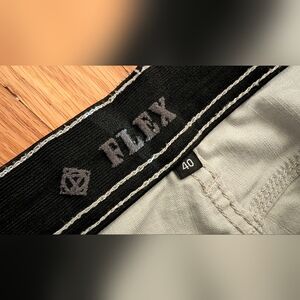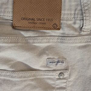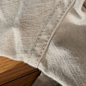 Off white pant fabric with black waistband and white contrast stitching. Clean, neutral look suitable for multiple outfits. Has some wear in the seat area, as shown in photo.