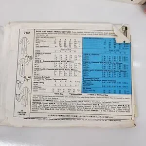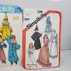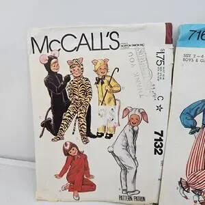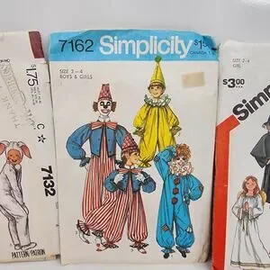 Set of 3 sewing patterns for children’s costumes and crafts from well-known pattern brands including McCalls, and Simplicity. Patterns include a variety of fun costume designs such as clown, tiger, bunny, angel, and witch. Great for sewing projects, Halloween costumes, school plays, or creative crafting.