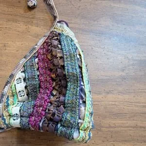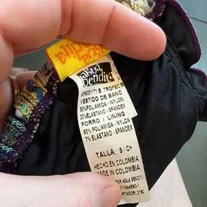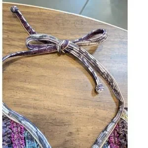 Agua Bendita bikini set features an intricate, handcrafted aesthetic with a mix of textures and patterns. The triangle halter top is adorned with colorful embroidery, sequins, and ruffled trim in shades of purple, teal, and gold. The matching side-tie bottoms showcase a feathered print with lettuce-edge trim and gold-tone hardware accents on the ties. Made in Colombia, this vibrant two-piece set offers a bohemian-inspired look perfect for resort wear or beach days.