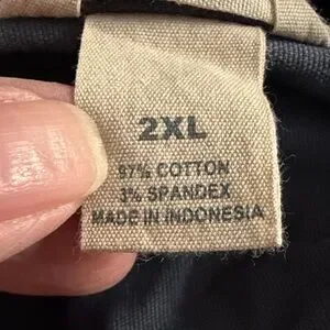 Classic button-up shirt from Duluth Trading Co. Solid navy color with a sturdy weave. Features visible button and collar detail. Simple, versatile workwear style.