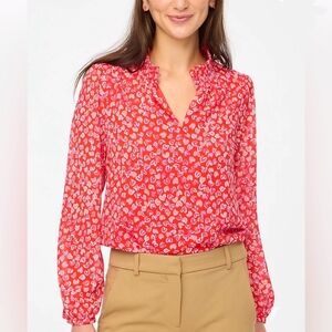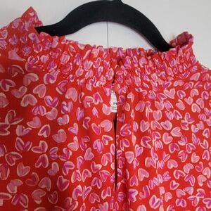 Bright and playful J.Crew heart print blouse in a vibrant red with pink and white heart pattern. Features a flattering ruffle neckline, soft lightweight fabric, and a relaxed drape that works beautifully for work, date nights, or Valentine’s outfits.