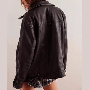 Relaxed leather jacket by Free People. Dark brown smooth leather with zip and flap pocket details. Full zip front and zip cuffs. Slightly oversized silhouette for layering.