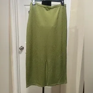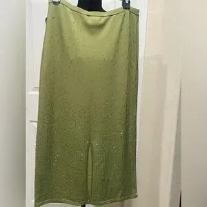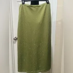 Stylish green KNIT RHINESTONE SKIRT BY House of Harlow 1960. Perfect for any occasion. PULL ON BACK KICK SLIT, COCKTAIL. EVENING OUT, VERSATILE OCCASION, MIDI LENGTH, PRE OWNED IN EXCELLENT CONDITION.