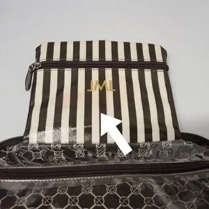 •1 attached interior zippered pouch (gold embroidered "JML" initials)