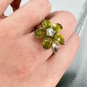 Beautiful vintage sterling silver flower ring featuring vibrant olive green peridot-colored gemstones arranged in a delicate floral design with a sparkling clear center stone. The faceted stones catch the light beautifully and give this piece a bold yet elegant look.