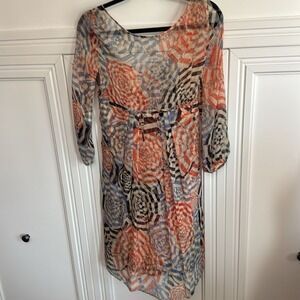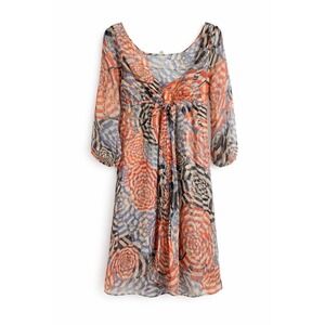Elegant silk dress with sheer top layer and vibrant red and blue patterns. Long sleeves and a flattering fit with drawstring. Perfect for any occasion.