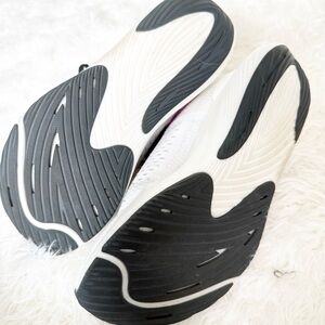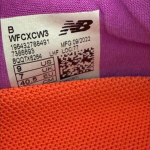 Lightweight New Balance athletic shoes with breathable mesh upper. Cushioned midsole for responsive support. Bold purple inner lining and trim for a stylish pop. Black laces and logo details add contrast.