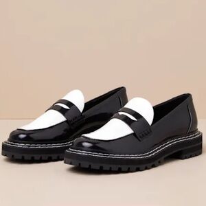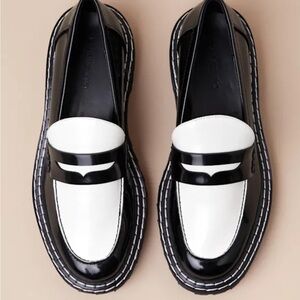 Stylish black and white loafers with a sleek design. Perfect for any occasion.