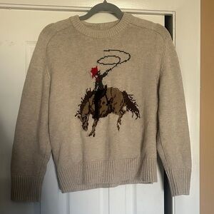 Beige crew neck sweater. Features cowboy and horse design. Perfect for casual wear.