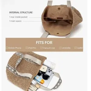 This elegant cream woven tote bag is perfect for any occasion. Its stylish design and spacious interior make it a must-have accessory. The neutral color complements any outfit.
