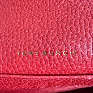 Chic Tory Burch crossbody in vibrant red. Pebbled leather finish. Ideal for versatile wear.