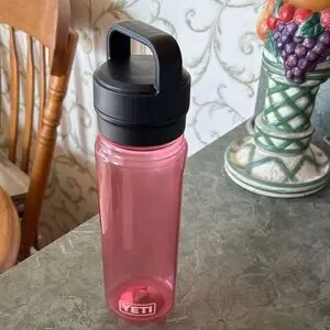 Sleek pink YETI bottle featuring a sturdy black lid. Perfect for hydration on the go.
