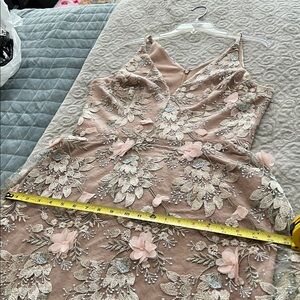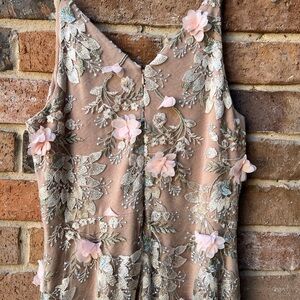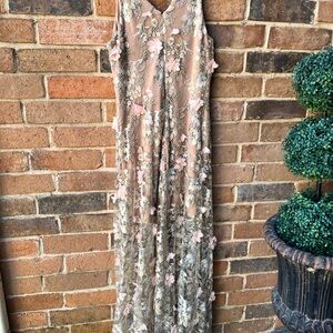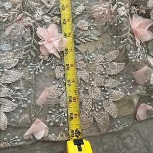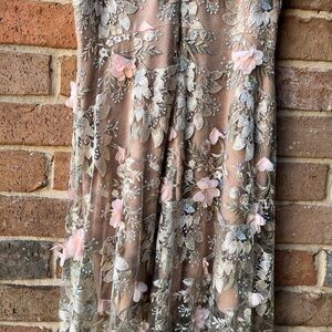 Sheer tulle skirt with intricate floral embroidery. Soft blush base with cream and olive embroidered detailing. Feminine and elegant silhouette. Ideal for special occasions. Worn only once and received tons of compliments! Measurements Shoulder to waist 16” , Waist across 16”, Hips across 20”, shoulder to floor 60”. Underskirt length is 35” and is nice and stretchy.
