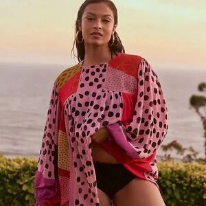 Length: 25" vibrant pink polka dot top with mixed-print colorblock details. Lightweight fabric and voluminous balloon sleeves create an effortless, on-trend silhouette. Versatile for casual or dressed-up looks. Features pink as the primary color with red and mustard accents.